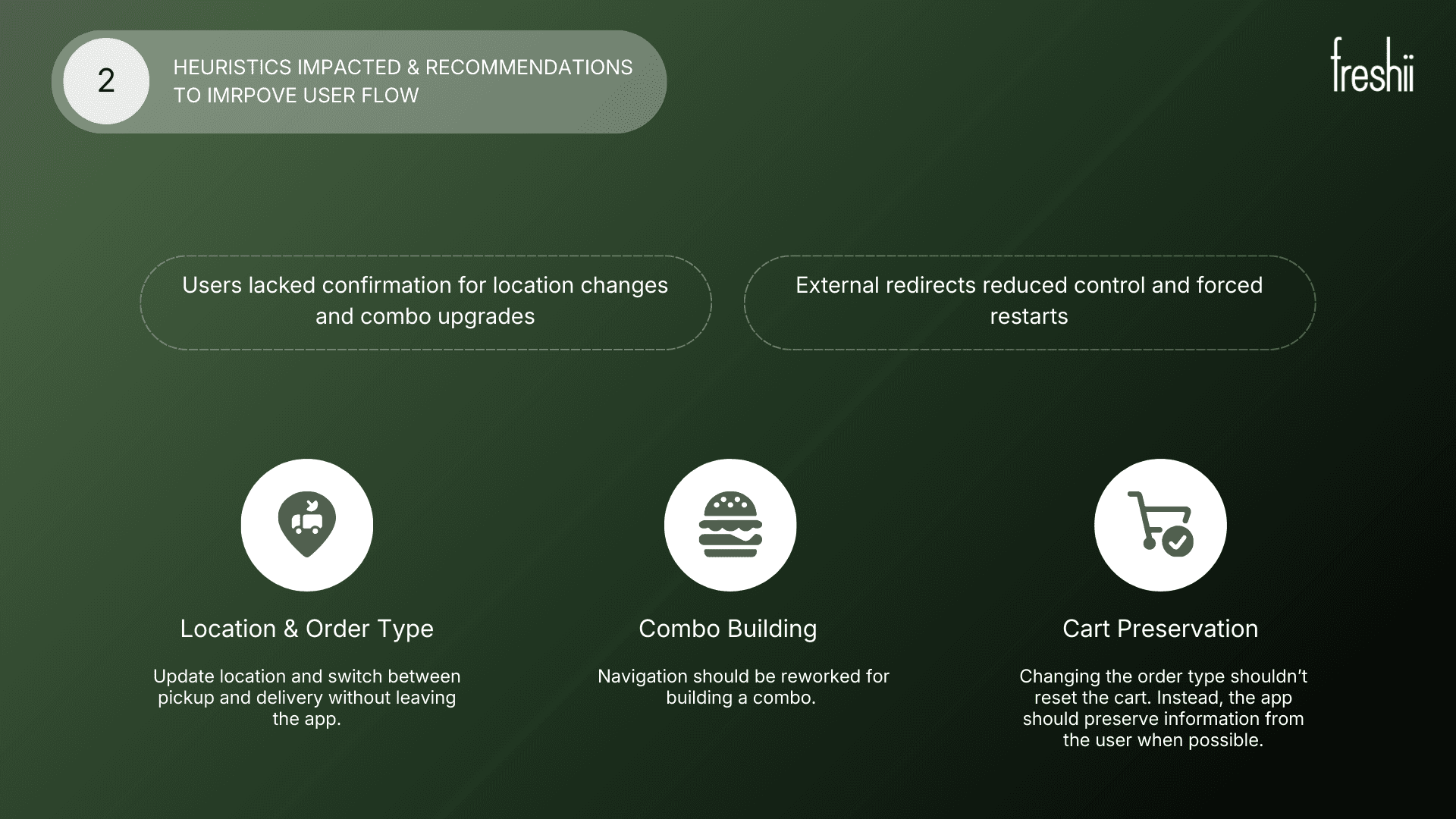 Recommendation: Simplify menu structure, use clear labels, and guide users step-by-step for customizations.Checkout Friction: Multiple steps and unclear progress caused frustration.
