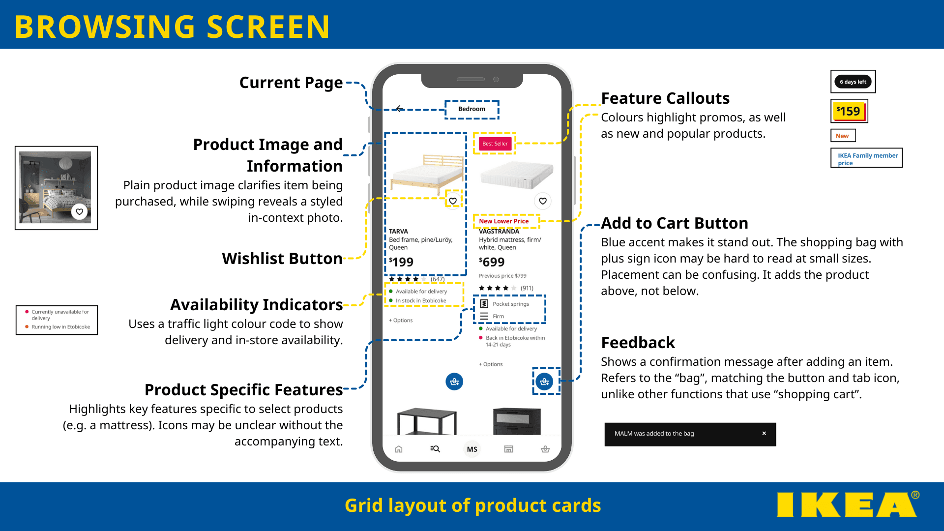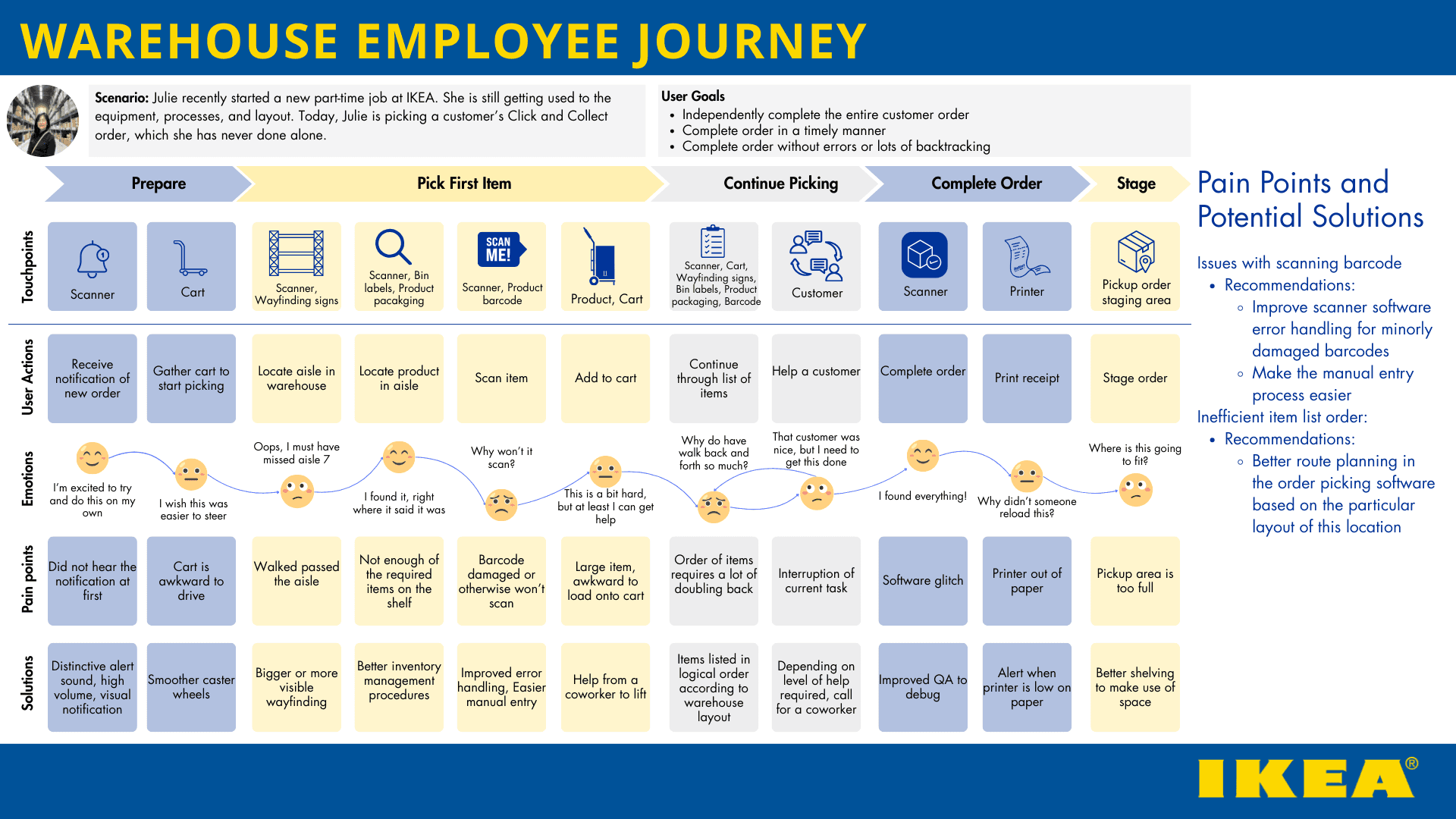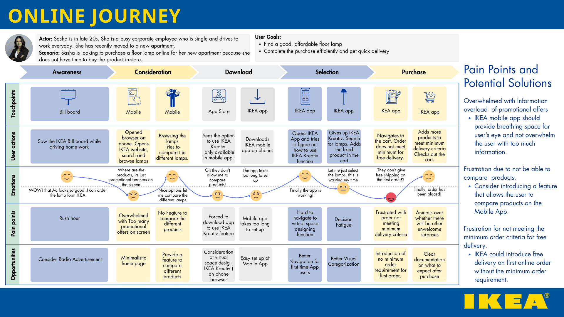Using qualitative methods such as user interviews journey mapping observational insights and pattern analysis the study examined the end-to-end IKEA experience from initial inspiration and online research to in store navigation checkout and post purchase assembly. This approach helped uncover emotional and functional friction points throughout the journey. Insights from this research informed opportunities to improve digital and physical integration wayfinding support information accessibility and overall user confidence.