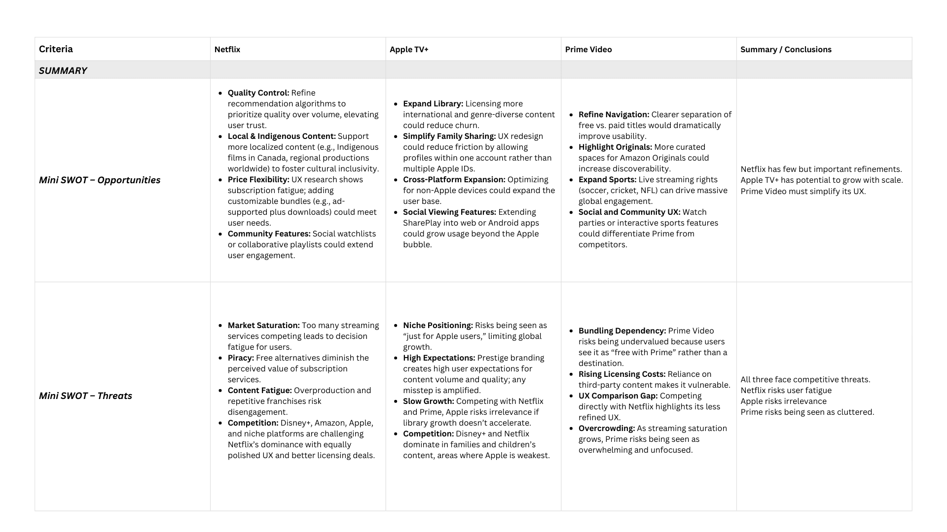 Competitive Analysis: Conducted a structured feature comparison between Netflix, Apple TV+, and Prime Video focusing on navigation, personalization, search functionality, and content presentation.