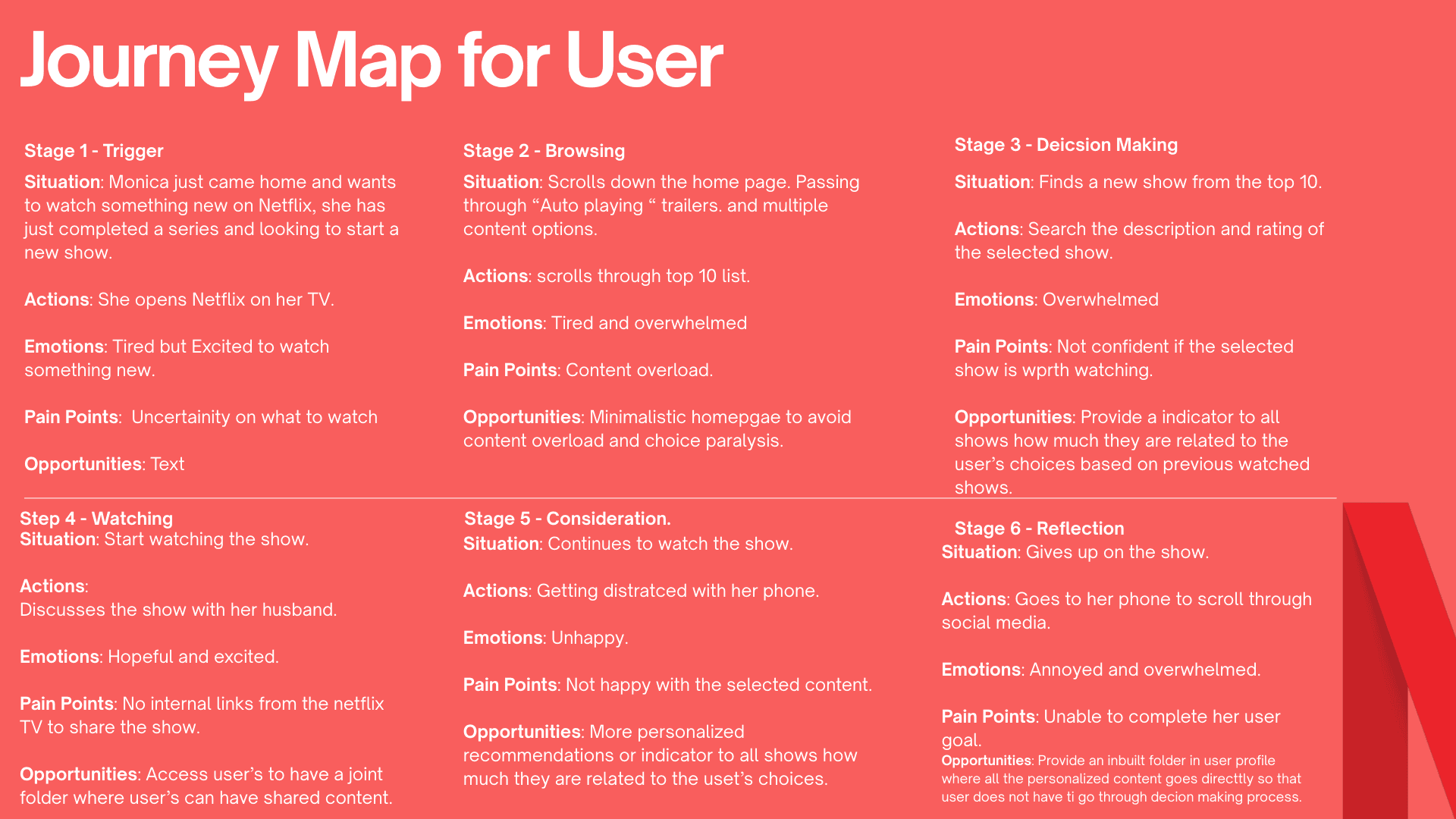 A user journey mapping how viewers discover, choose, and engage with content on Netflix, highlighting key touchpoints, emotions, and friction points to improve decision-making and viewing flow.