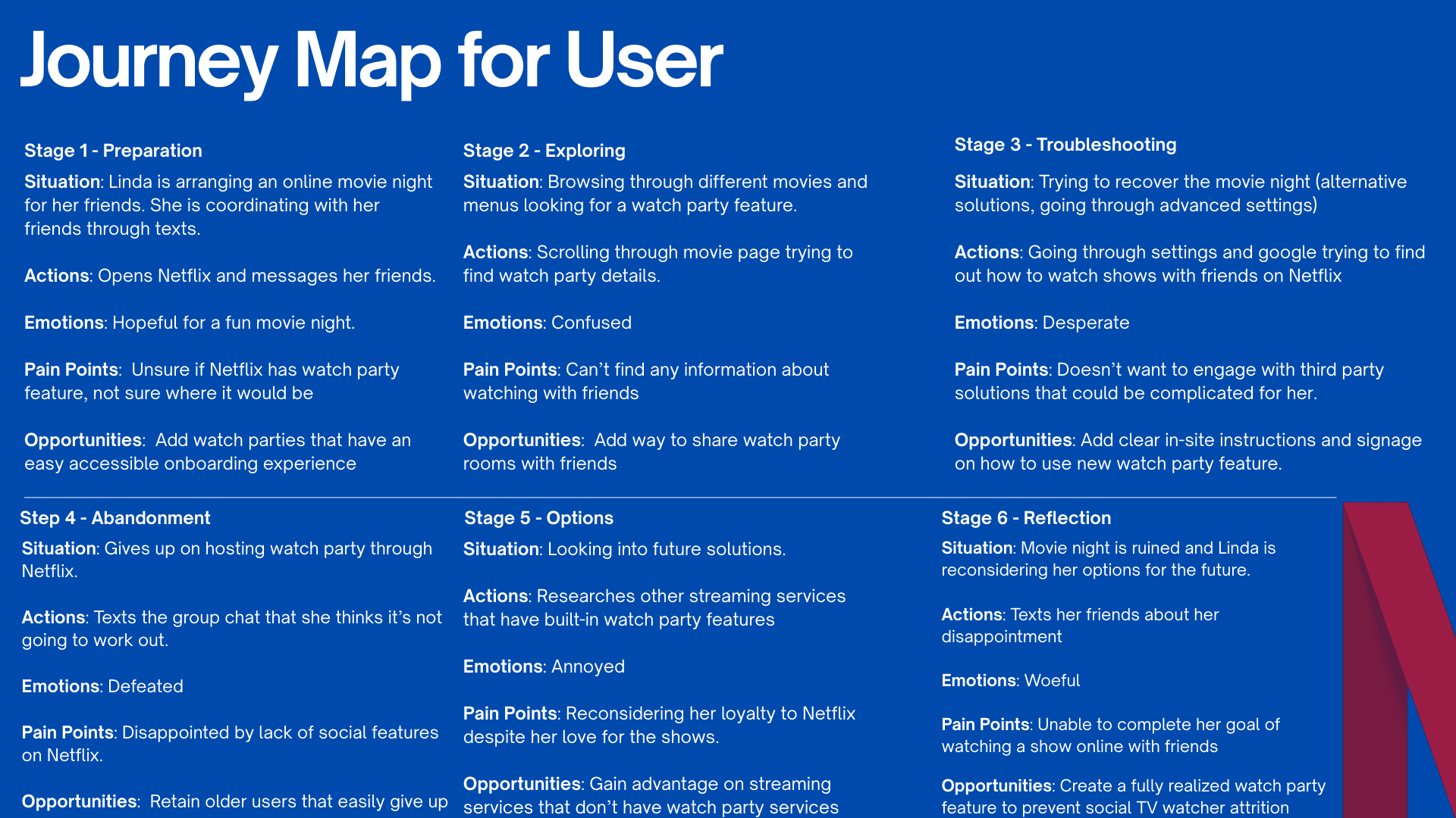 Competitive Analysis: Analyzed other streaming platforms (e.g., Disney+, Hulu) to benchmark discovery features and highlight gaps.