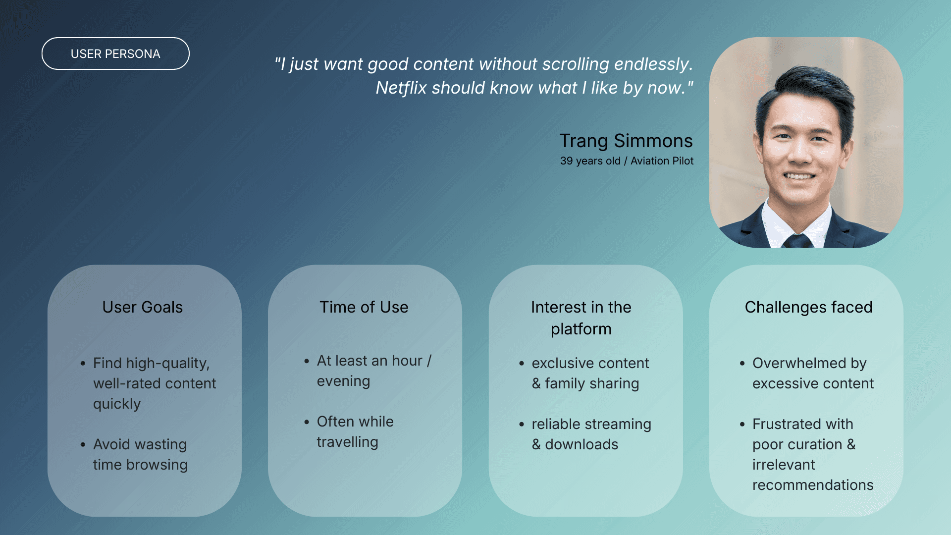 Users have lost confidence in Netflix’s recommendation system because it does not reliably surface content that matches their preferences. This makes content discovery feel overwhelming and time consuming, which impacts how often people return to the platform.